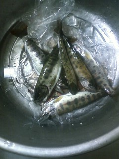 つりかえったヤマメは先日作ったふきのとう味噌を塗って焼いて食べました。ん~美味!