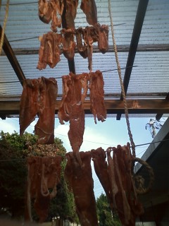 ソミュール液(香辛料と塩水)に漬けて一日。陰干しで数日。その後燻製と言う段取りです。まだ完成にはしばらく掛かりますが、こうご期待!
