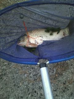 オジサンが竿に近づくと竿は大きく曲がり、間髪を入れずオジサンは合わせを食らわします。乗りました!川藻に潜られないように、浮かせながら寄せてくれればタモですくい易いのに、魚は暴れ放題なかなか寄ってくれません。40センチほどのフナに翻弄されている、オジサンへたくそ!^^)やっとの思いでタモ入れをしてあげましたが・・・鯉釣りでこのタモ・・・たとえ鯉が釣れても絶対入らんわー。