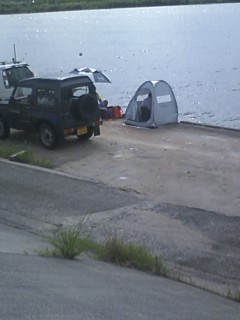 我が社の宍道湖用の船の状態を見に川に出かけたところ、船の近くで竿を5本出して鯉釣りをしている人がいました。