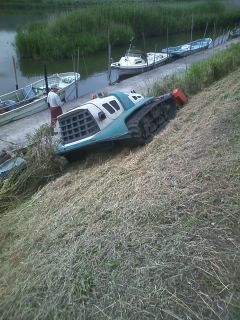 我が町斐川では、川土手の草をリモコンの戦車のような格好をした草刈ロボットで刈っています。
