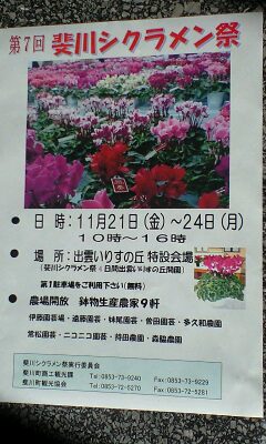 今年もイリスの丘特設会場にて11月21日より24日までシクラメン祭りが開催されます。色々なイベント、プレゼントが用意されているようです。斐川の平野に点在する栽培農家を見るもよし、会場で賑わうもよし。詳しくは斐川町役場商工観光課まで。