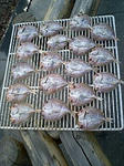 この時期、天気になると私の趣味の干物作りが始まります。今日は昨夜から塩水に漬けていたチダイとレンコ鯛を、玄関の車寄せの屋根に干しました。日差しも強く、ほどほどに風もあり最高の干物日和。